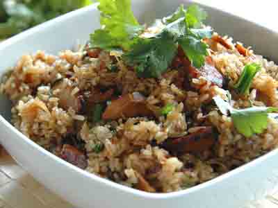 Maria's Tips: Add corn starch into the beaten eggs to make it easier to create a complete omelette. Add water gradually when stir frying the glutinous rice. Pour in water only when the rice gets dry.