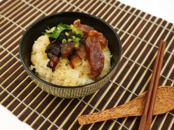 在大碗中混合调味料,拌入蒸好的糯米及炒过的腊味,最后加入蛋丝和葱花即可上碟。