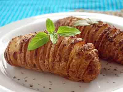 Preheat Multifunctional Steam Grill Oven to 220˚C. Cut potatoes, with flat side down, at about 2-3 mm intervals. Cut almost all the way through but just so all slices are connected at the bottom.
