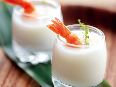 蛋白打勻,混入相同份量的水或雞湯,蝦去殼後,插入蛋白液中(突出尾部)。