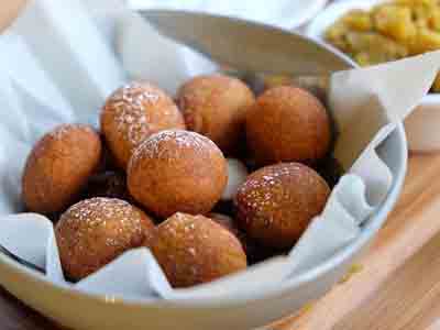 把粉團放入鍋內炸至外層開始硬身,用鑊鏟按壓粉團,重複4-5次。