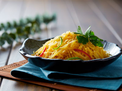When potato strips turn semi-translucent, add rice vinegar and salt. Close the lid again and let it stir-fried until evenly cooked.
