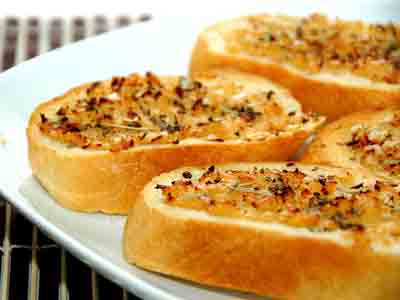 Mix chopped garlic and parsley with melted butter and then spread it on sliced bread.