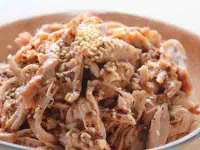 Take the chicken out of the Rice Cooker when it is cooked. Shred the meat into strips with your hands. Pour the sauce on top.