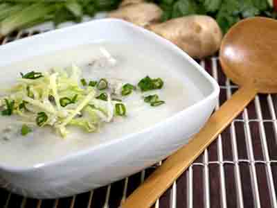 Soak rice grain in water for about an hour, then drain and set aside. Wash and soak dried peel for later use. Chop lettuce and ginger into thin threads.