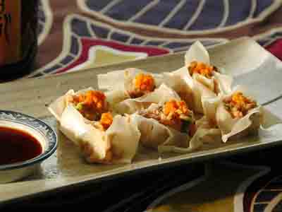 蟹肉和豚肉同放碗中,加入调味料拌匀,然后混进其余材料拌好,成烧卖馅料待用。