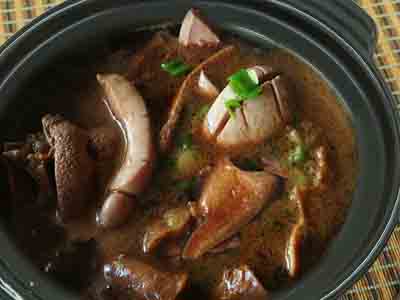 姜、干葱、蒜、葱放入变频万用养生锅爆香,加猪腰、猪肝炒熟备用。