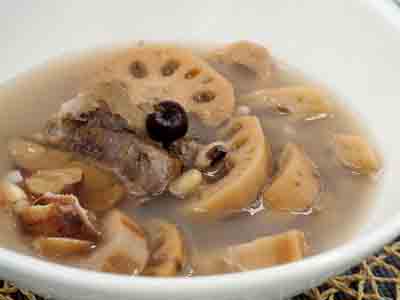 Blanch lean pork. Remove shells of the walnuts. Rinse lotus roots and seeds.