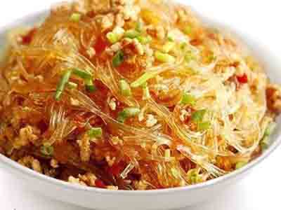 Add the pork and stir fry until it is cooked. Stir in bean threads and cook until it beocomes slightlty dry.