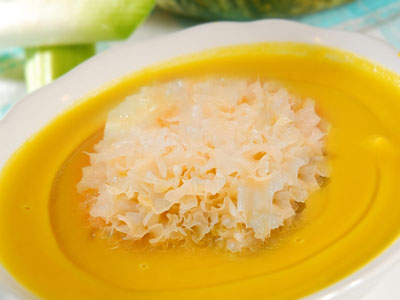 Blend dried scallops, pumpkins, stock and water in the Professional High Speed Food Processor. Pour the mixture into the bowl with fungus and top with a few Chinese wolfberries.
