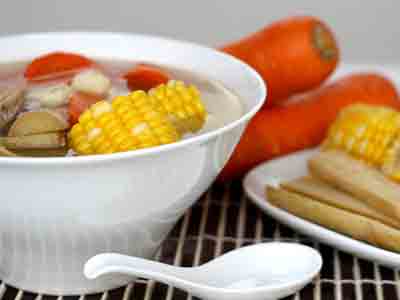 Wash all ingredients. Peel sugar canes and carrots, cut them into pieces; peel water chestnuts; break corn into small chunks.