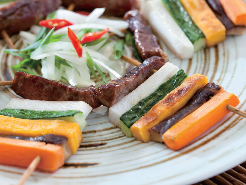 Skewer the ingredients. Place the skewers onto the Korean Barbeque Grill, select medium-high heat and grill until both sides turn golden yellow. Then, select medium heat and grill the skewers until fully cooked. Sprinkle pine nuts on top. Serve.