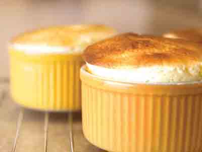 拌好的蛋白漿放入已上糖的焗盅內,然後置於光波萬能煮食鍋中的低架上,以180°C焗12分鐘即成。