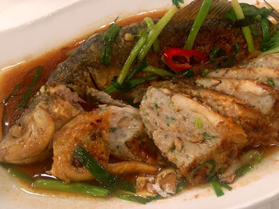 将姜片下油起锅,鲮鱼落锅煎熟,盛起备用。