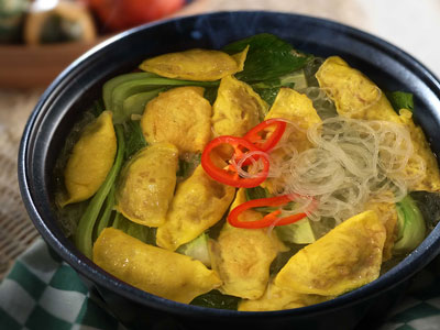 上汤落锅煮滚,放入粉丝、小唐菜、蛋饺同煮至熟,最后加胡椒粉调味即可。
