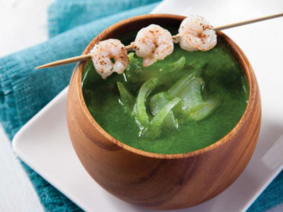 锅中下菠菜、白豆、洋葱、虾仁、高汤,