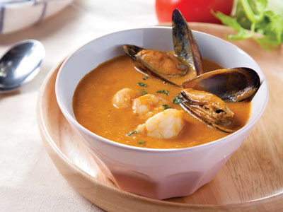 Remove the fish head. Put the rest of the fish, vegetable soup and hot water into the Professional High Speed Food Processor. Select the "Bisque" function. Lastly, put in the cooked seafood. Serve.