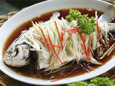 最后放上葱丝、姜丝、蒸鱼豉油及熟花生油即成。