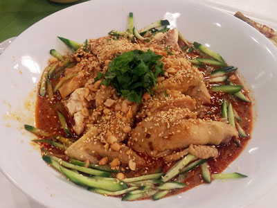 鸡只熟透后取出切件及淋上口水汁及洒上白芝麻即成。