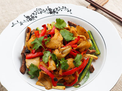 Stir fry the bell peppers until tender. Put in the geoducks and and stir until fully cooked.