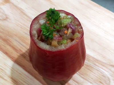 Stuff the wax apples with the assorted diced pork. Lastly, place the coriander on top.