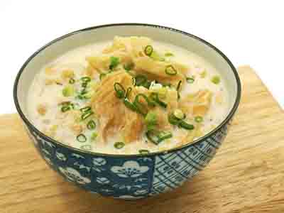Soak soy bean overnight. Chop up pickles and Chinese doughnut. Tear dried seaweed into small pieces.