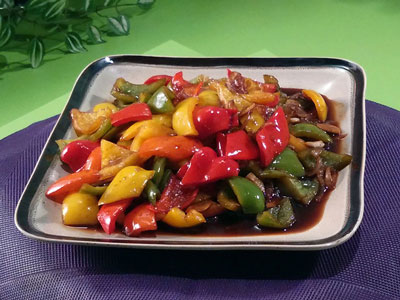 Maria's Tips: Add corn starch slurry after the sauce is reduced to enrich the flavour of the tri-colour peppers.