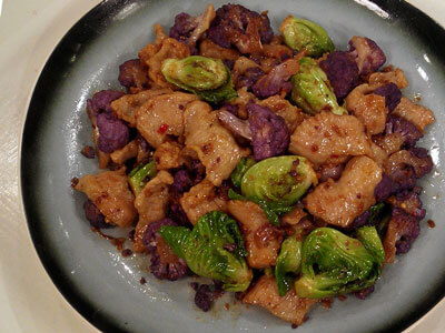 Add sugar and water. Stir fry until the ingredients are 80% cooked. Put in the pork cheek. Stir well and serve.
