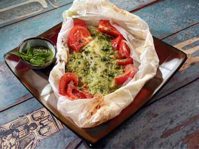 龙脷柳涂上橄榄油,以盐调味料,再涂上青酱,与法边豆及番茄一同以牛油纸包好。