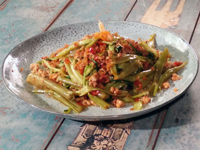 锅中下油烧热,放入豆瓣酱、虾米、免治猪肉及辣椒丝爆香。