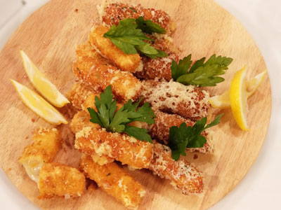 鸡蛋拌匀成蛋液,涂于芝士条上,再沾上面包糠。重复以上步骤。