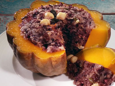 Put a layer of rice into the pumpkin shell. Then, cover with a layer of red beans. Repeat until the pumpkin shell is filled.