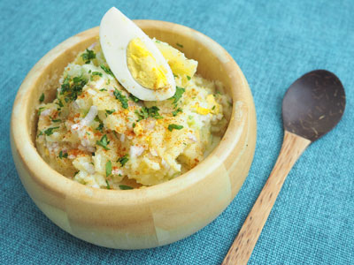 馬鈴薯取出去皮,放涼後將一半壓成蓉,另一半則切粒,與薯蓉、蛋粒和西芹粒拌勻。