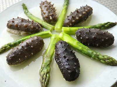辽参肚内涂上生粉,酿入肉末,放入可折叠式高速电蒸锅,蒸30分钟。
