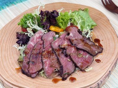 拌匀汁料,与牛扒上碟,洒上芫荽碎和薄荷叶碎即成。