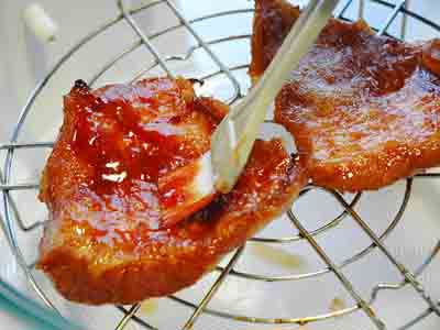 猪颈肉置在光波万能煮食锅中的高架上放平,以250°C烧8分钟,扫上蜜糖,反转再烧5分钟即可。