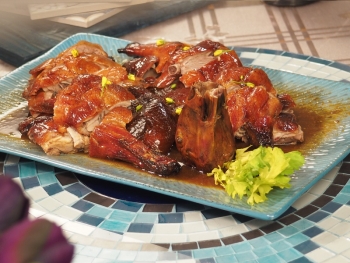 将鸭置网架上,放入二合一蒸气焗炉,以热风对流模式,180°C焗45分钟或先焗鸭肚再翻转鸭背焗至皮脆肉香