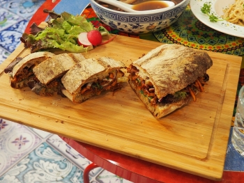 将意大利拖鞋包烤热后切半,淋上初榨榄橄油及白松露油 ,再撒上适量盐及黑胡椒碎,再放上沙律菜及炒好的鸡髀菇即成。
