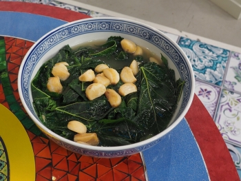 蒜粒下油镬爆香,加入鸡汤煮沸后,再加入桑叶用变频万用养生锅「煮」模式煮约 5-10 分钟,下适量盐调味即成。