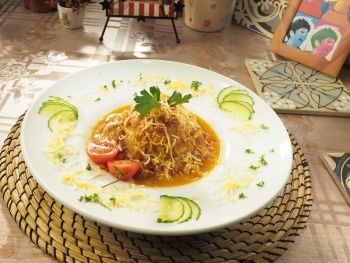 取出鱼翅瓜后用叉将瓜肉挖成丝,与肉酱拌匀,放上爆香的烟肉脆粒即成。
