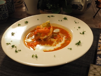Sieve off lobster heads and shrimp heads from soup. Then pour soup into the Cooker. Add chicken stock and black pepper crushed. Add brandy until it boils. Turn off the Cooker. Mix lobster meat and fat with soup and then serve.