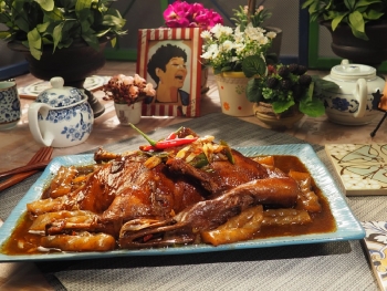 变频万用养生锅以「炒」模式热锅,待油热后,将米鸭下锅煎香外皮,之后加入姜片、香叶、桂皮、陈皮爆香,再加入碎冰糖、生抽、老抽、余下磨豉酱、柱侯酱、豆瓣酱和适量水煮滚,盖好转小火炆45分钟或放入超级全能饭煲,炆煮30分钟