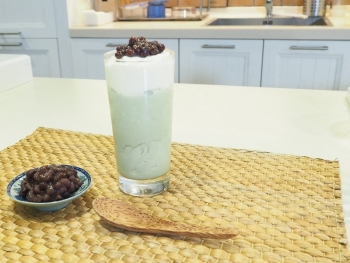 倒鮮奶入電動奶泡機,加入抹茶粉及糖,按下加熱鍵,1至2分鐘後將抹茶奶倒入杯,加入冰塊,奶蓋放面,再放上紅豆作裝飾,即可享用。