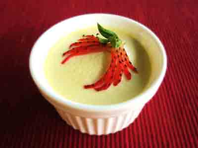 混合液慢慢地倒于布丁杯中 (隔去泡沫),置入冰箱冷冻约2-3小时。