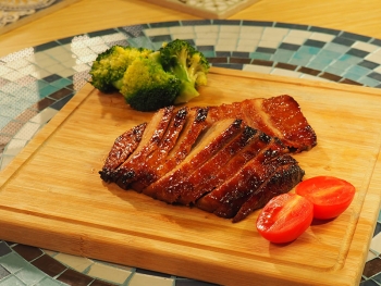 将已腌好豚肉放入德国宝玻璃光速炸锅,以225°C烧约8-10分钟,然后翻转再烧至微焦香,接近完成时扫上蜜糖略烧,即可。