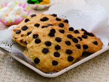 ake 2 tbsp of dough per portion. Place on baking plate lined with baking paper. Flatten with fork. Top with chocolate chips.
