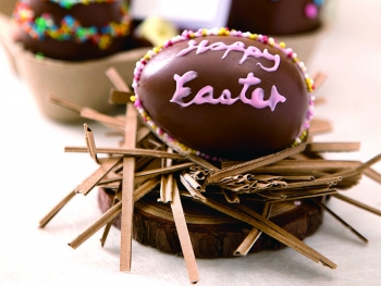 复活蛋模内用颜色朱古力笔画上花纹,稍待至凝固。