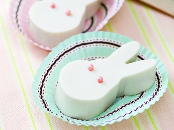 Transfer solution into cake mould and let cool. Refrigerate until set. Remove. Shape into bunnies with cookie mould. Serve.