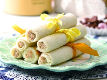 用擀麵棍把麵包壓薄,鋪上吞拿魚醬,捲起,用沙律醬封邊,壓實,綁上絲帶,完成。