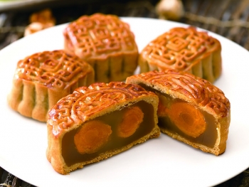 白莲蓉分成80 克一份,每份包入2 个鹹蛋黄成球状。